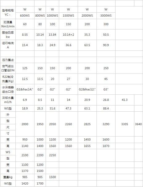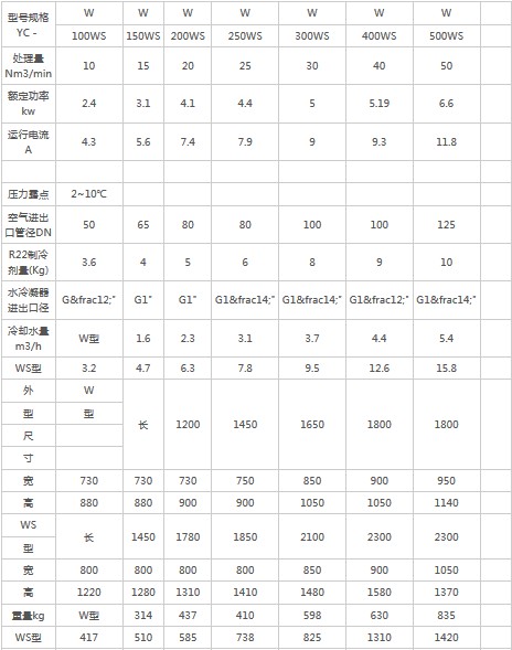 冷干機(jī)的技術(shù)參數(shù)主要有:處理量(Nm3/min),進(jìn)氣溫度(℃) ,工作壓力(MPa) ,壓力降(MPa) ,壓縮機(jī)功率(Kw) ,冷卻水耗量(t/h).